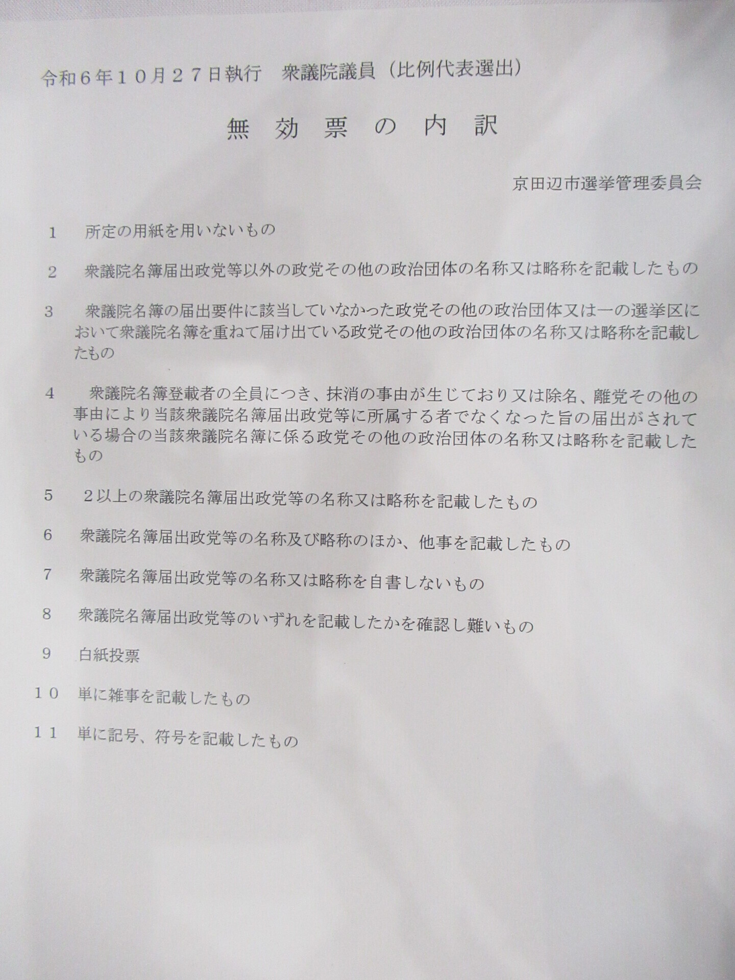 京田辺市では、今回の総選挙比例選挙での投票総数は32395人で、有効票は31859票、無効票は536票でした。(小選挙区の無効票は563票)その内「白票」は312票でした。「白票」も何も書かれていないことを確認するために、立会人のところに回ってきて数などを確認しています。